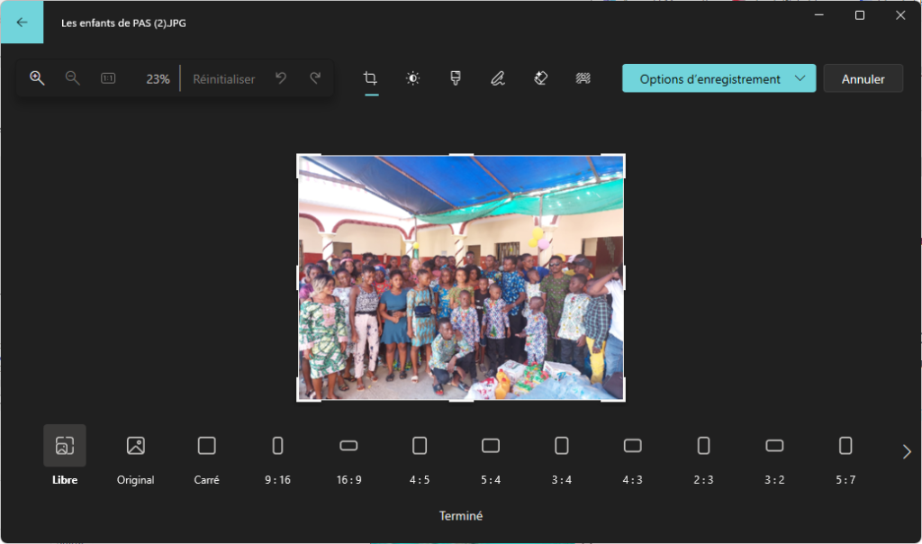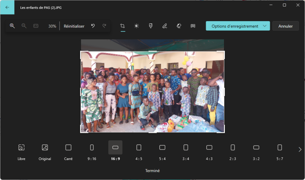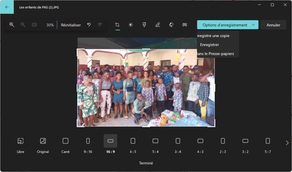 Cliquer sur 16:9 et recadrer la photo en déplaçant la sélection avec la souris