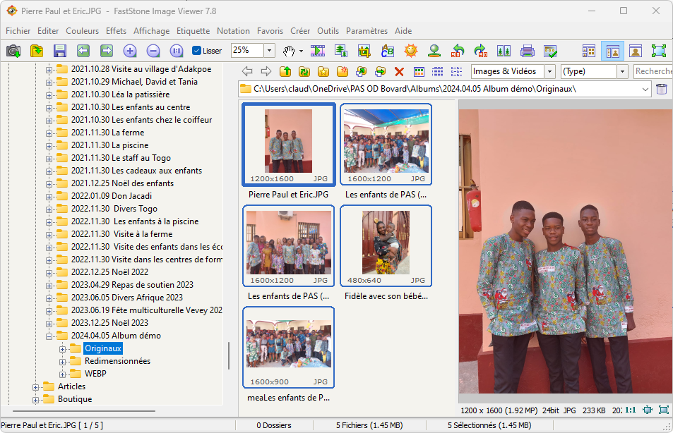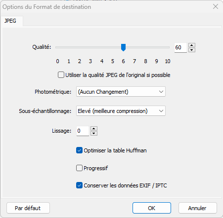 Cliquer avec le bouton de droite de la souris sur une des photos sélectionnées, dans le menu choisir Outils/Conversion groupée et ajuster les paramètres