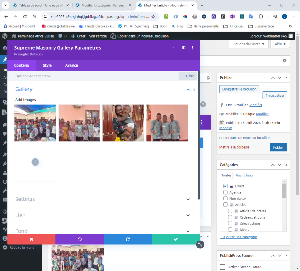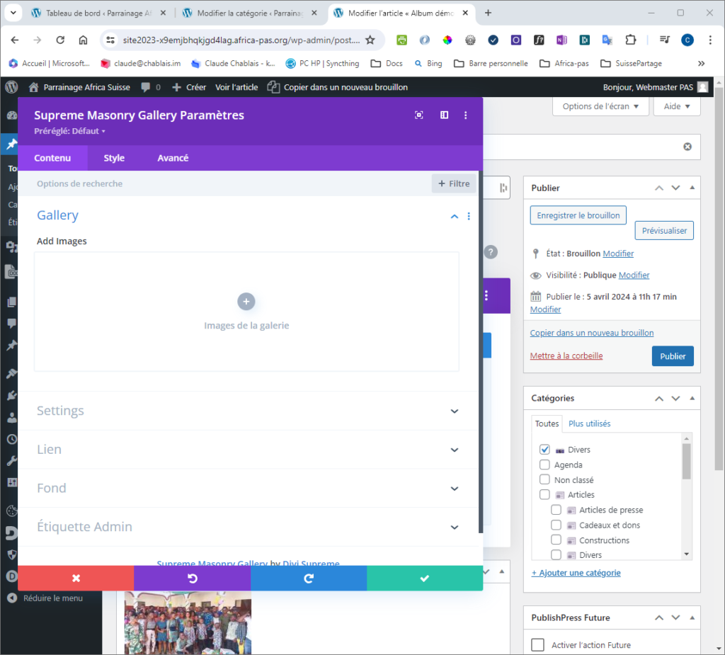Cliquer sur la roue dentée du module Supreme Masonry Gallery